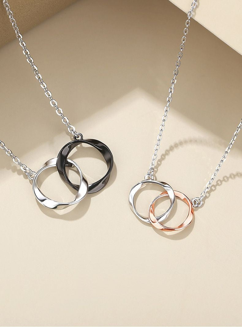 永遠の愛を意味するメビウスリングがおしゃれなペアネックレス。片方のリングにはきらめくキュービックジルコニアが散りばめられ、シンプルで上品なデザインが魅力です。