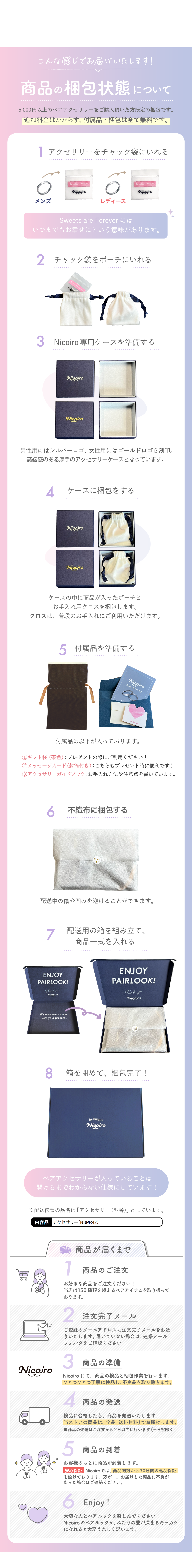 店舗の維持費や人件費をかけずに、その分を価格に反映することで、より手に取りやすい価格でペアアクセサリーをお届けしております。